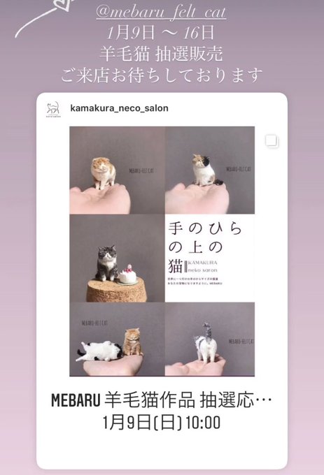 0 9 今日から抽選販売スタートです✨ 皆様、ご都合の良い時にご来店下さいませ〜🐱💕🐾 #鎌倉ねこサロン #MEBARU #羊毛フェルト #抽選販売 #ねこ 22/01/09 09:34