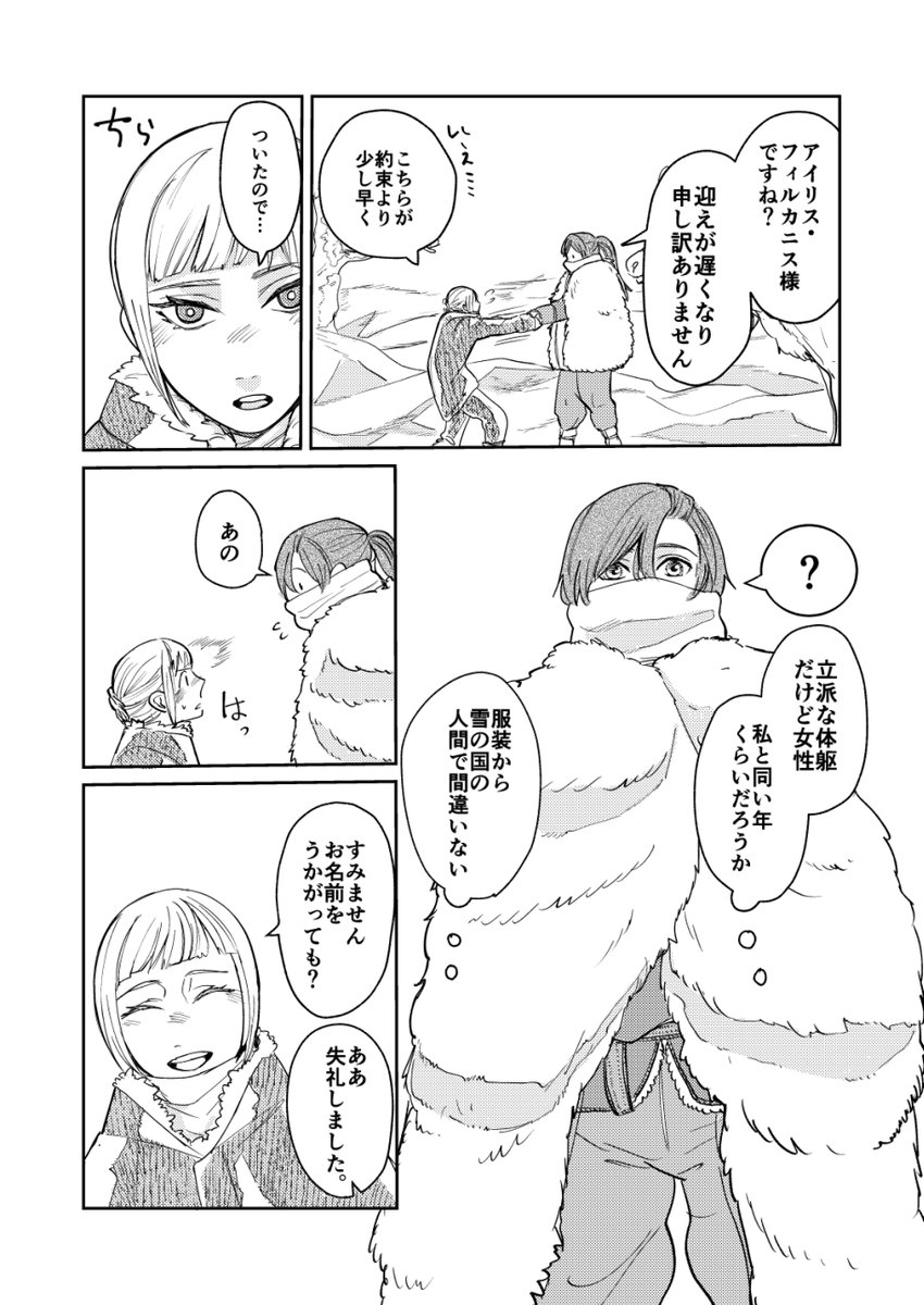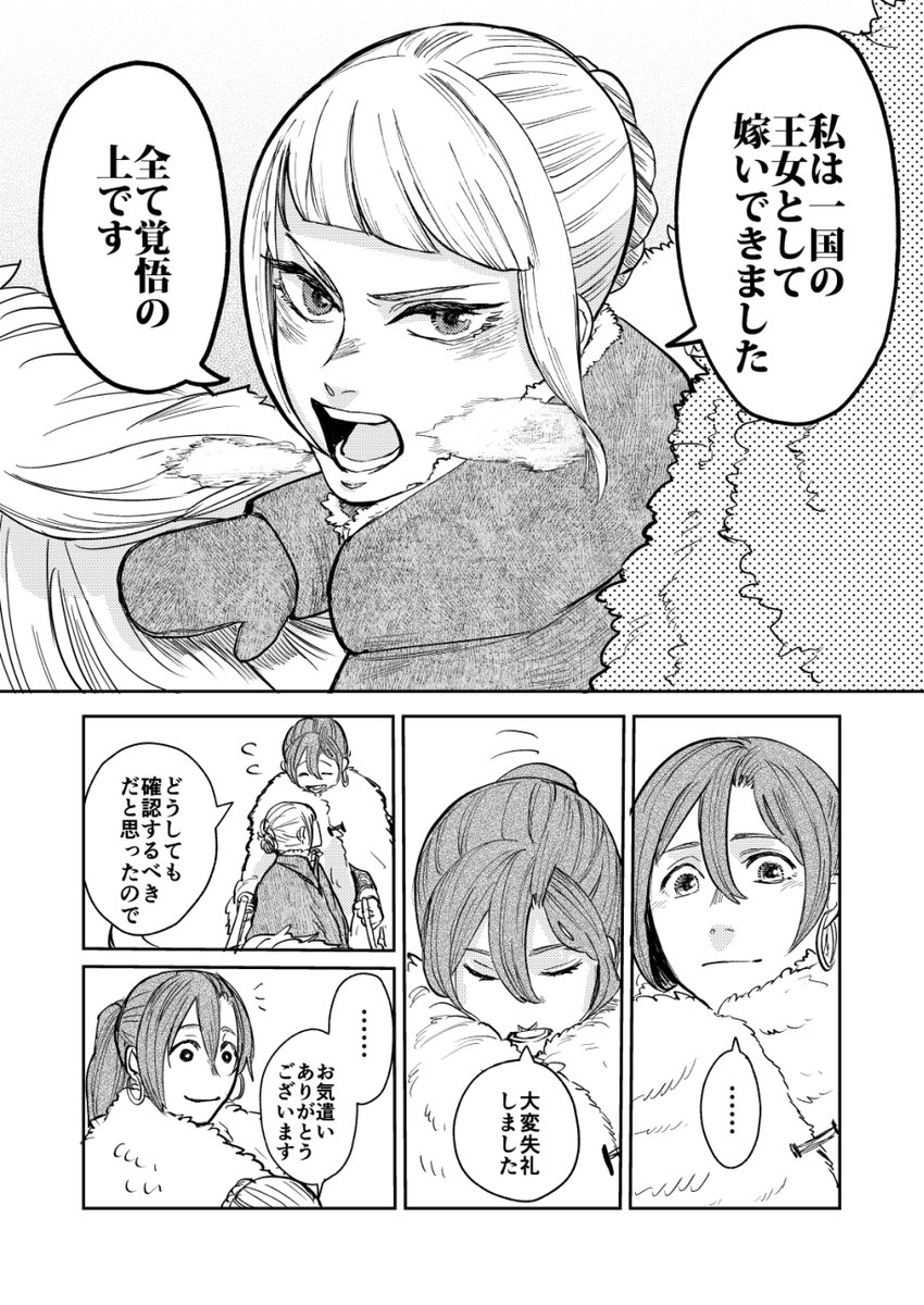 23 429 砂ばかりの灼熱の国の王女が雪の国に嫁入りする話。 (4/6) #創作百合 #漫画が読めるハッシュタグ 23/03/17 18:03