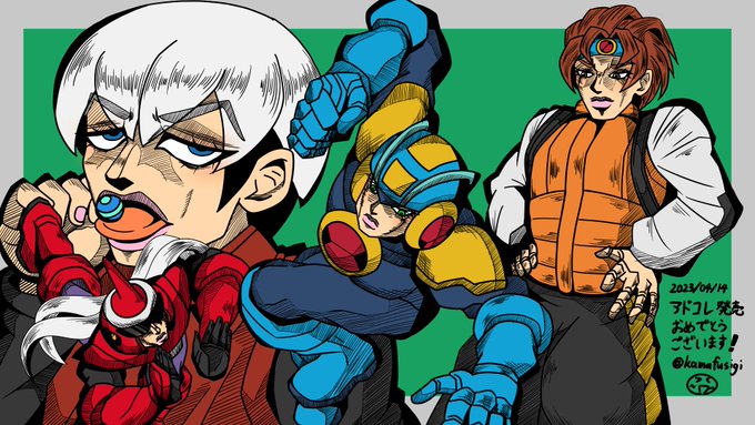 ロック君、エックス君、少し早いけどヴォルナット君も誕生日おめでとう!! これは去年描いた絵ですの 今年も何か描きたい #ロックマン35周年 #ロックマンX29周年 #ロックマンDASH25周年