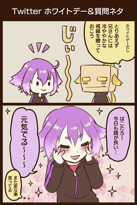 Twitterでのホワイトデーつぶやき&質問回答より📦🐶 はこたろーさん推しのしるこさん好き過ぎる…… Qはこたろーさんの可愛いところ A顔面 って、元気でるってそういう事でした?? #bintrollFA