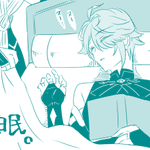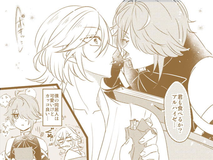 #kavetham #カヴェアル 🏛ポキ…ポキ…モグモグ… 🌱「おい…🏛絨毯に零すなよ」 🏛「僕は子供か!この稲妻のお菓子、手軽に食べれて美味しいんだ」 🌱「ほぅ…」
