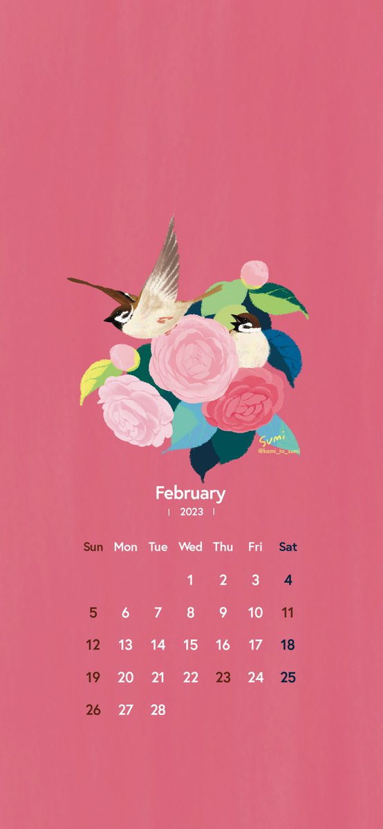 2月の壁紙ができました🥳 祝日表示あり/Japanese Calender 今月は乙女椿と雀です。 どなたでもご自由にお使いください🫖 ※個人利用の範囲で、スマホの壁紙としての使用に限ります たくさんの人に届いてほしいので、RT歓迎です📮🕊 #フリー壁紙 #雀 #illustration #12か月の花鳥画カレンダー
