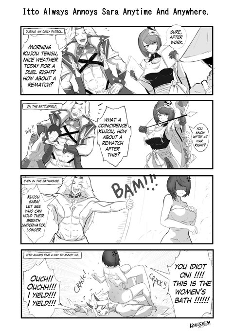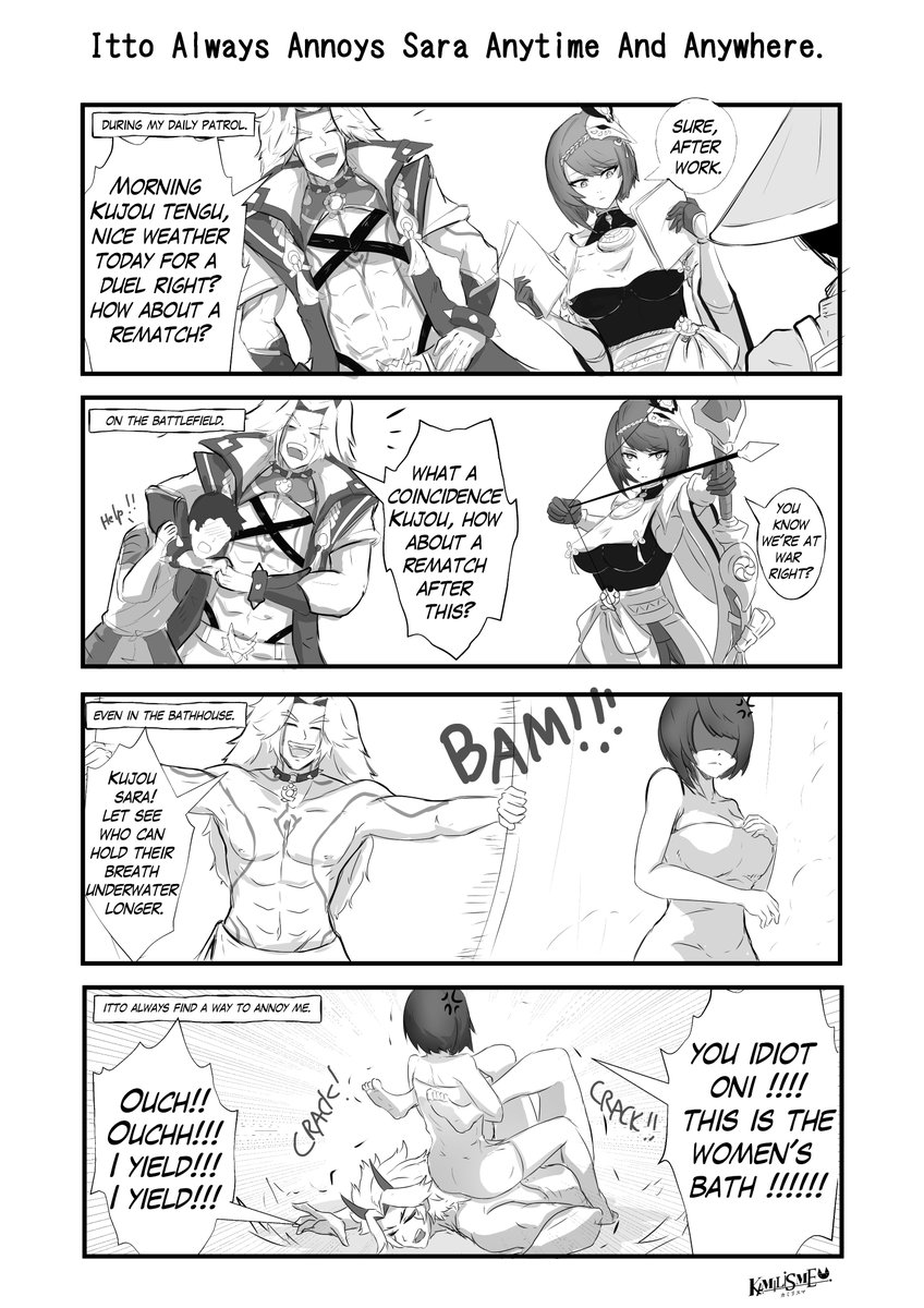 GISC #2 Itto Always Annoys Sara Genshin Impact Shorts Comic : Itto Always Annoys Sara Anytime And Anywhere Arataki Itto use every chance he can find to challenge Sara for a duel, even in the bathhouse. #九条裟羅 #KujouSara #aratakiitto #荒瀧一斗 #itto #GenshinImpact #原神