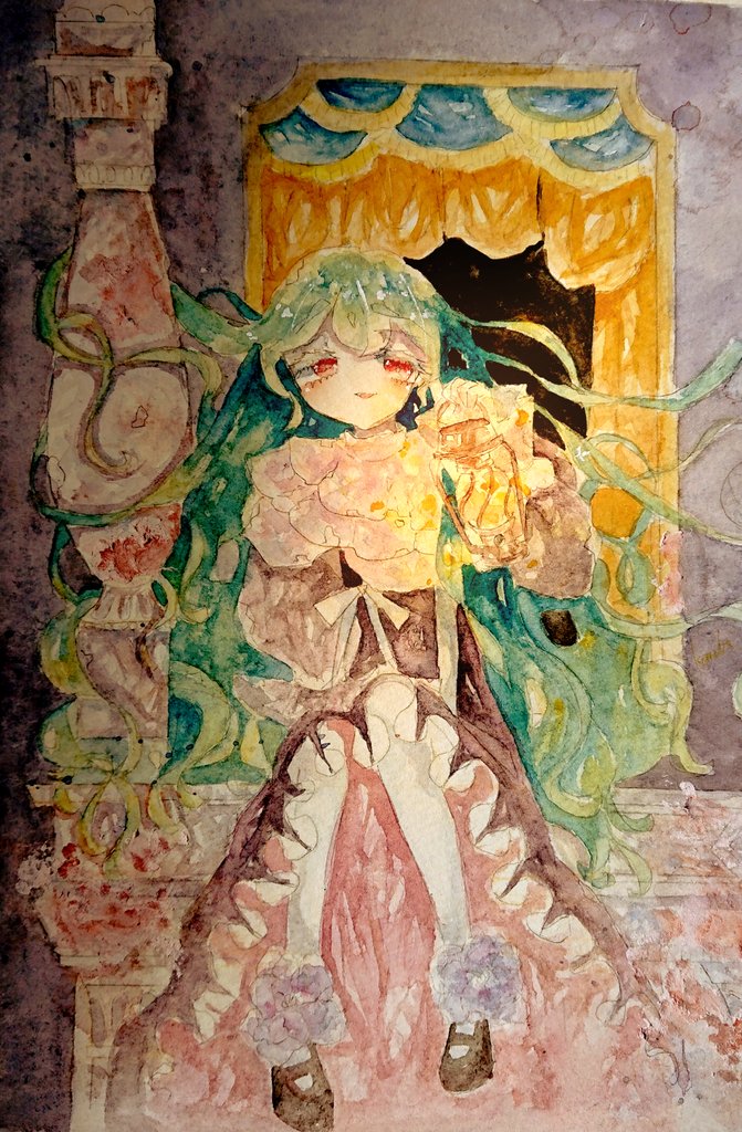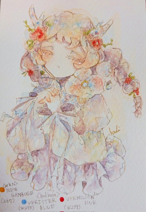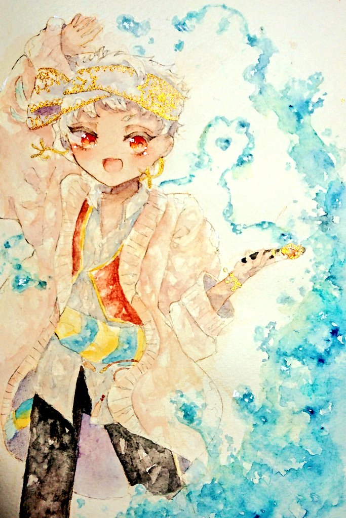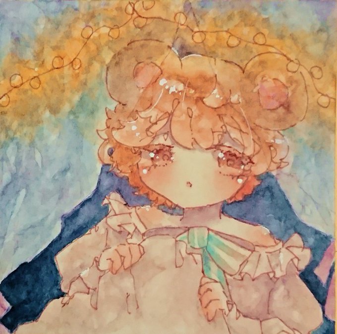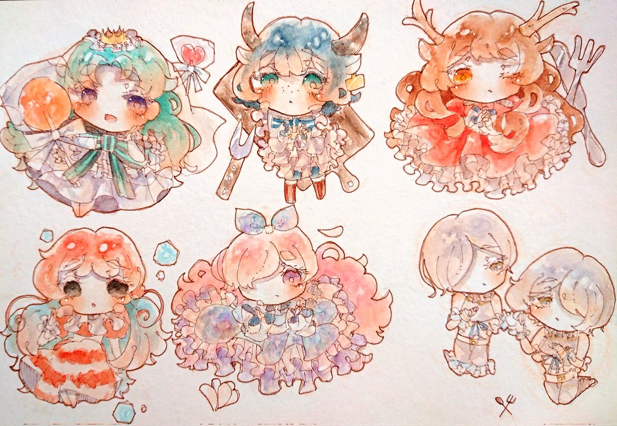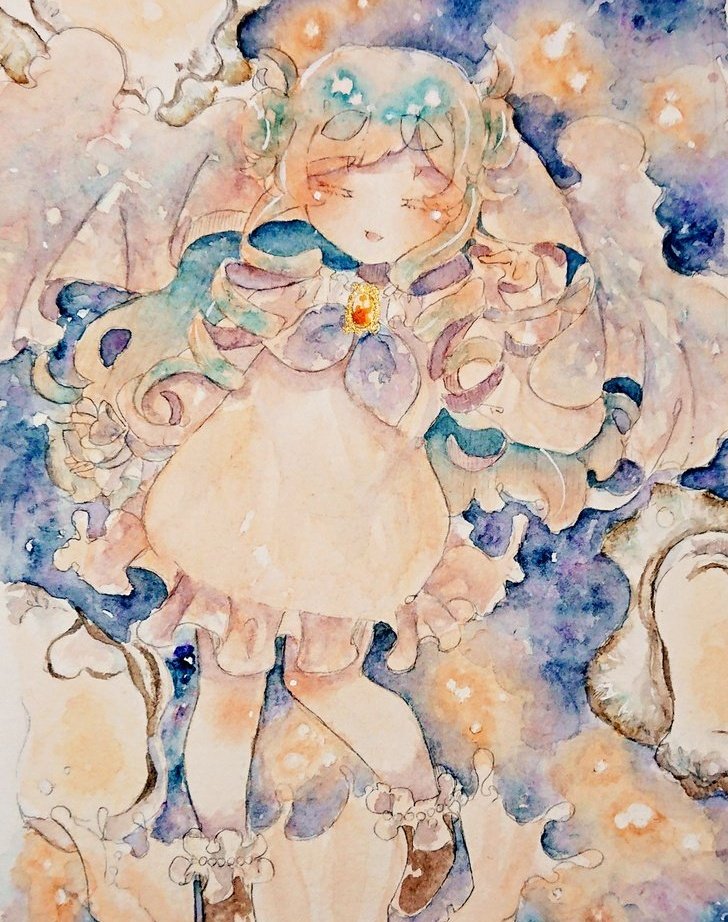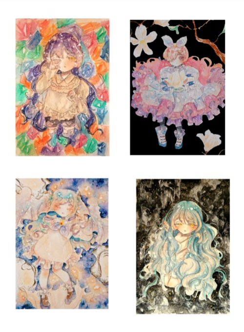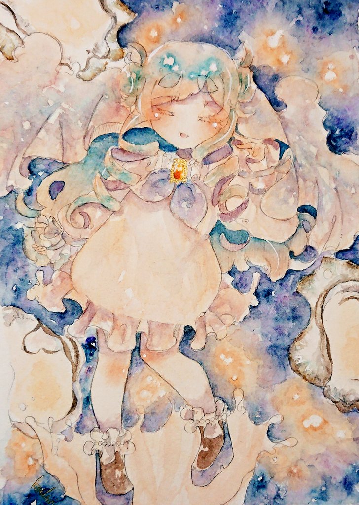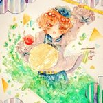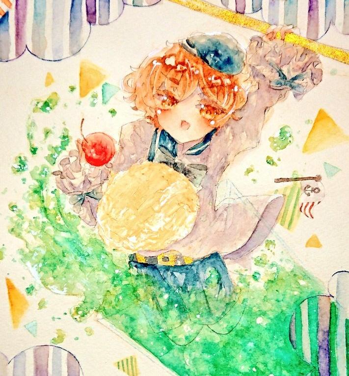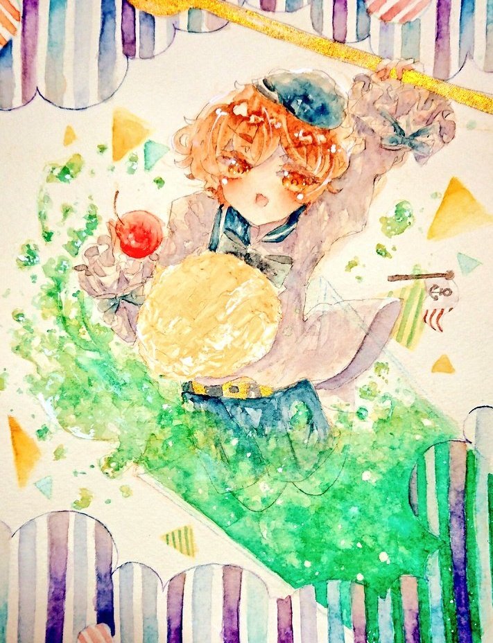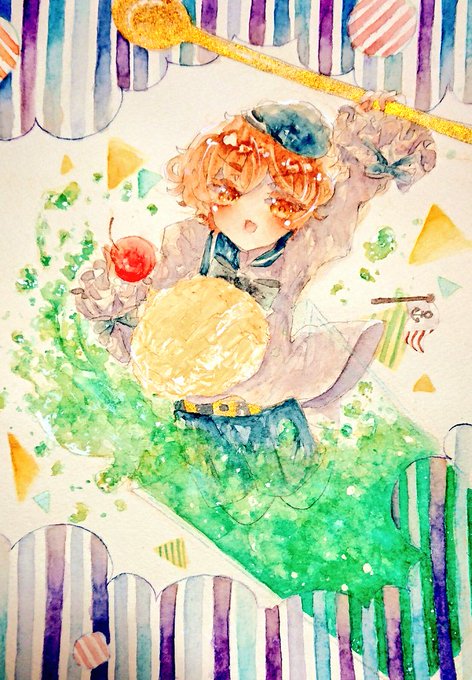 #水彩の魔術師の集い 「私は煌めきの魔法使い」𓂃 𓈒𓏸◌𓍯 主に食べ物などをモチーフに少年少女を描いております。 (下の3枚は牛、ポップコーン、メロンソーダ、水晶がモチーフになってます)