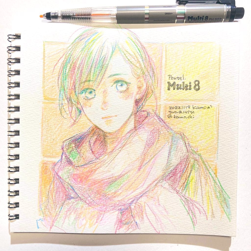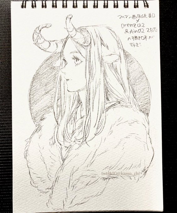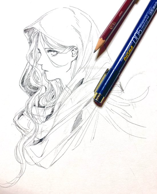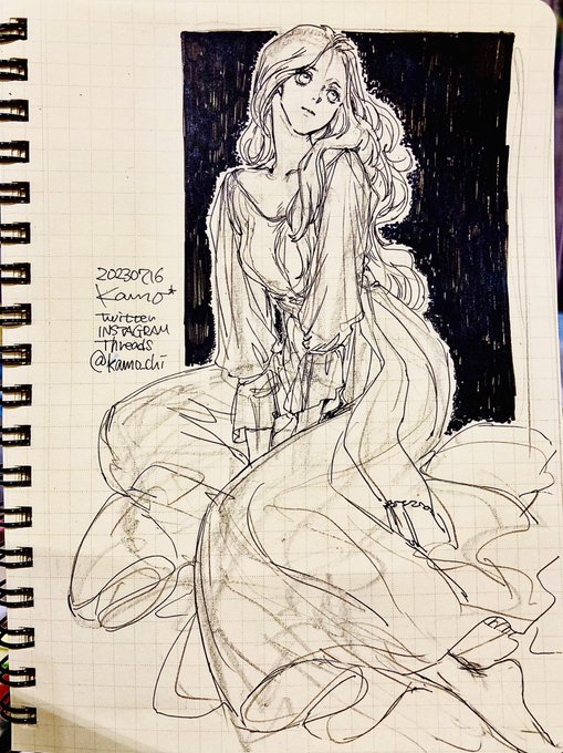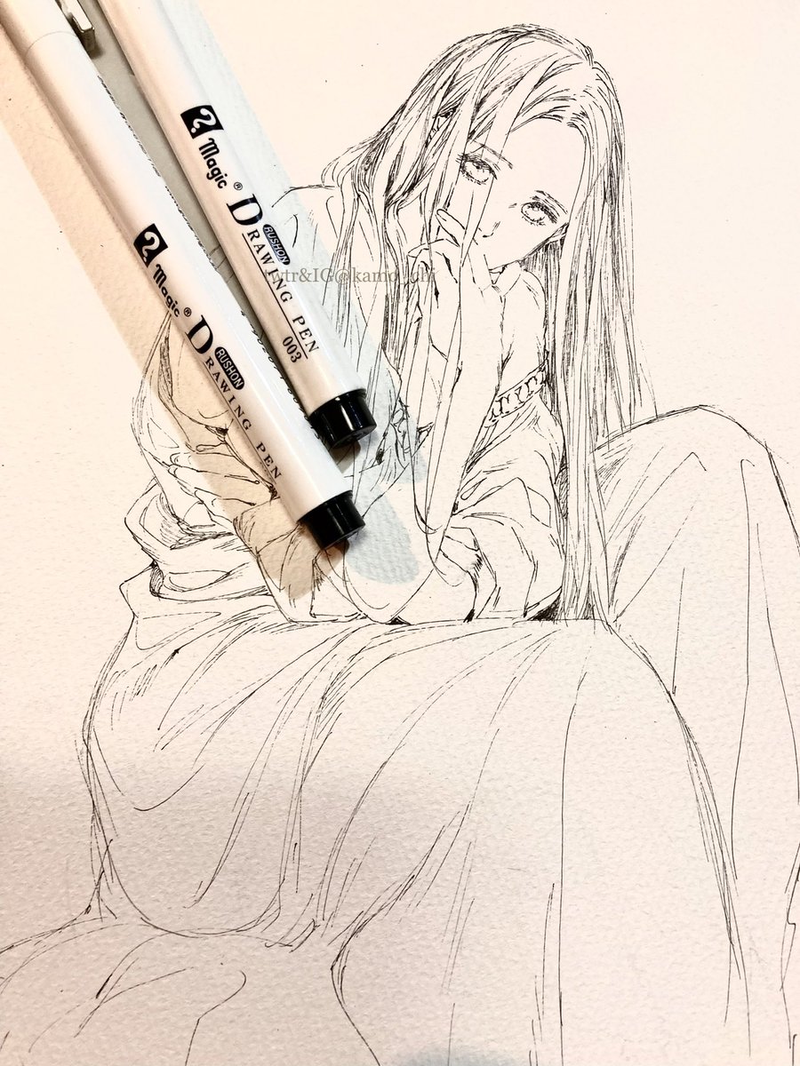 今日生まれたらくがきです。 制作期間なので調子良いです。 #kamo_drawingartist もっと絵の研究したいなぁ。 ペンはsigno 0.28(uniballONE軸使用)とぺんてるさんの慶弔筆ペン{速乾}です。 今回の制作用雑記帳はロールバーン。デビューしたばかりなので使い終わるまではこれです😇