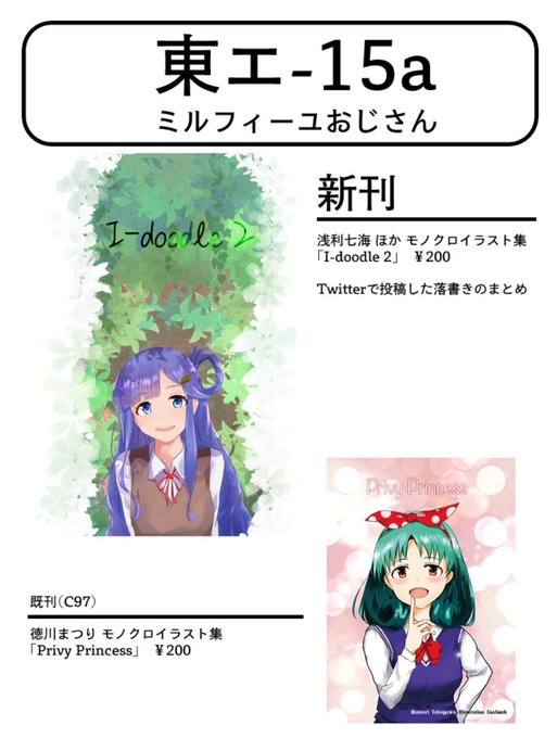 2 2 【いつもの前日告知】明日のコミケ2日目、東3ホールエ15aで最近のTwitter落書きをまとめたコピ本出します。ほぼ七海、ちょっとだけ霧子 21/12/30 23:15