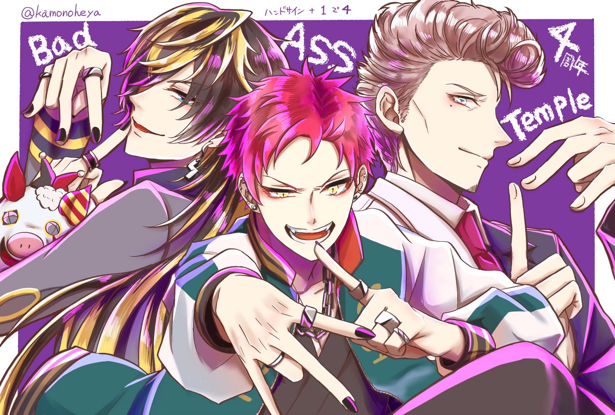 ヒプマイ4周年なので 4つくってもらた⑤ #ヒプマイファンアート 📿「ハンドサインは外せねぇだろ」 🌖「でっでも1足りないっすよ!あ!こうすれば…!」 ⚖️「強引な手だが…まぁいい」