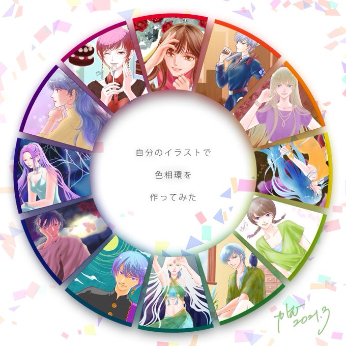 全部オリジナルでまとめたら、圧倒的に女の子多し(・∀・) 多色使いだから、こじつけの色相環かな! テンプレはこちら⇒ sunset3.bufsiz.jp/colorwheel.html #自分のイラストで色相環を作ってみた