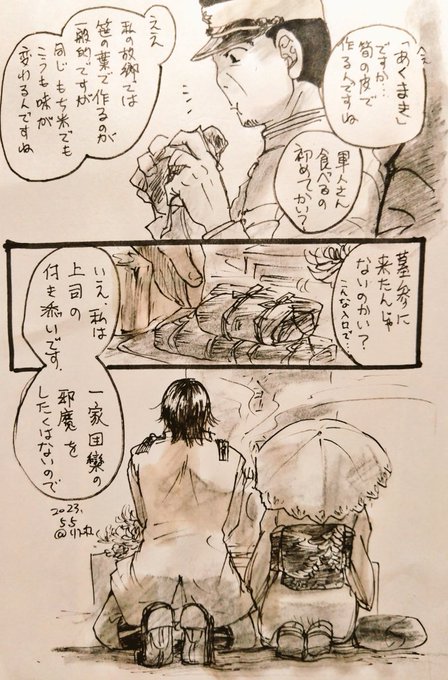 #ゴールデンカムイ版深夜の真剣お絵描き60分一本勝負 お題『子供の日』 筍の皮でもち粉を包んだ「あくまき」を鹿児島では端午の節句に食べるそうですね。きっと鯉登家にも鯉登家の味のあくまきがあるんだろうな。 1人宅飲みしてたから参加遅刻です〜😅