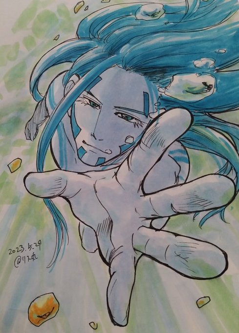 #ゴールデンカムイ版深夜の真剣お絵描き60分一本勝負 お題『水色(ライトシアンなど)』 18巻といえば、この二人✨✳✨ 2人同一画面の表紙はおっさんずモブもとい北のダンディデュオだけだったね。 アニメになったら、やたらイケボで可愛くてなぁ…