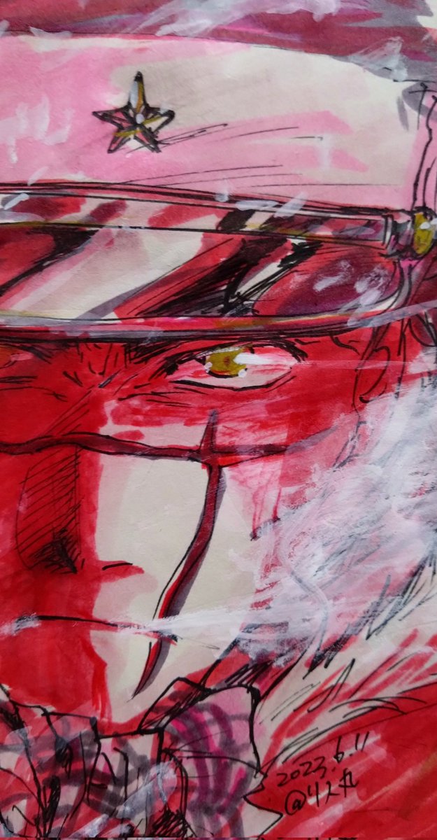 #ゴールデンカムイ版深夜の真剣お絵描き60分一本勝負 お題『赤、赤紫、金色』(20巻イメージ) 写真撮るので四苦八苦した挙げ句サムネがヤバい事になる💧 20巻も内容濃いけど、やはり表紙の杉元のガチ切れっぷりがカッコイイ✨ ハンドロ〜