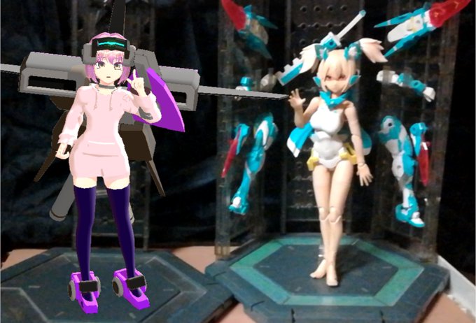 どうという事のないツイに多数いいねが付く これはどこからか手が伸びて来て沼に引きずり込もうとする プラモ界隈で言う通称マドハンドという現象! ということでエレクトリアコードにはARモードもあるので うちのこと照度不足なものの #メガミデバイス 朱羅忍を並べて一枚