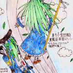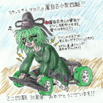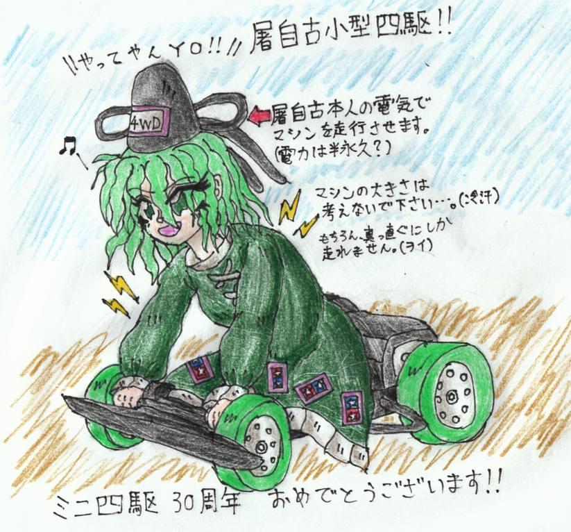 #10月25日は屠自古の日 ミニ四駆30周年記念の時に描いた「屠自古小型四駆」(東方小型四駆とは別)を再掲。 下半身部分を小型四駆化して、雷を操る程度の能力で小型四駆を走らせるというトンチキなイラストです。 スカートのお札もタミヤマークになっています。