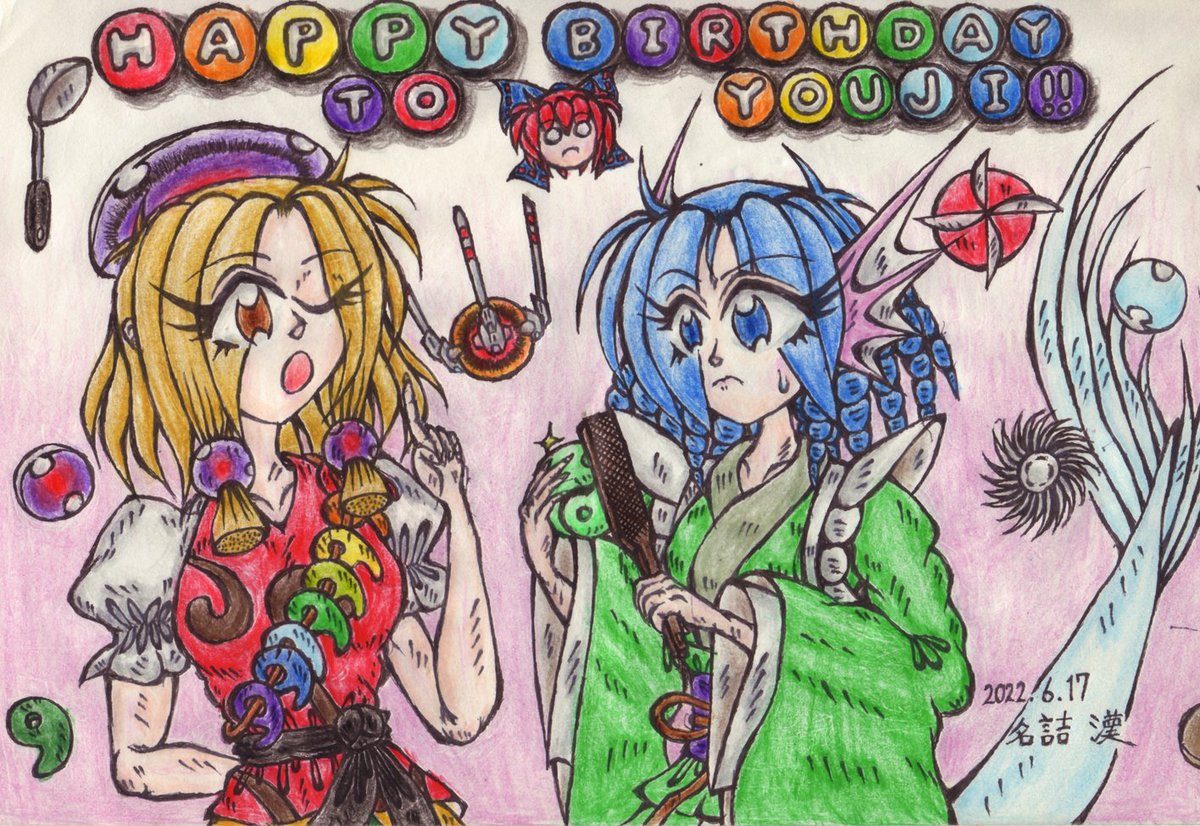 #堀川雷鼓合同誌4 来たる9月19日に開催される「東方輝針城」にて8yさん(@raiko_hachiY)が頒布される「堀川雷鼓合同誌4」でイラストを1枚描かせて頂きました! 雷鼓と某横STGの自機のひとつを擬人化風に組み合わせたイラストです。 それでは、宜しくお願いします! twitter.com/raiko_hachiY/s…