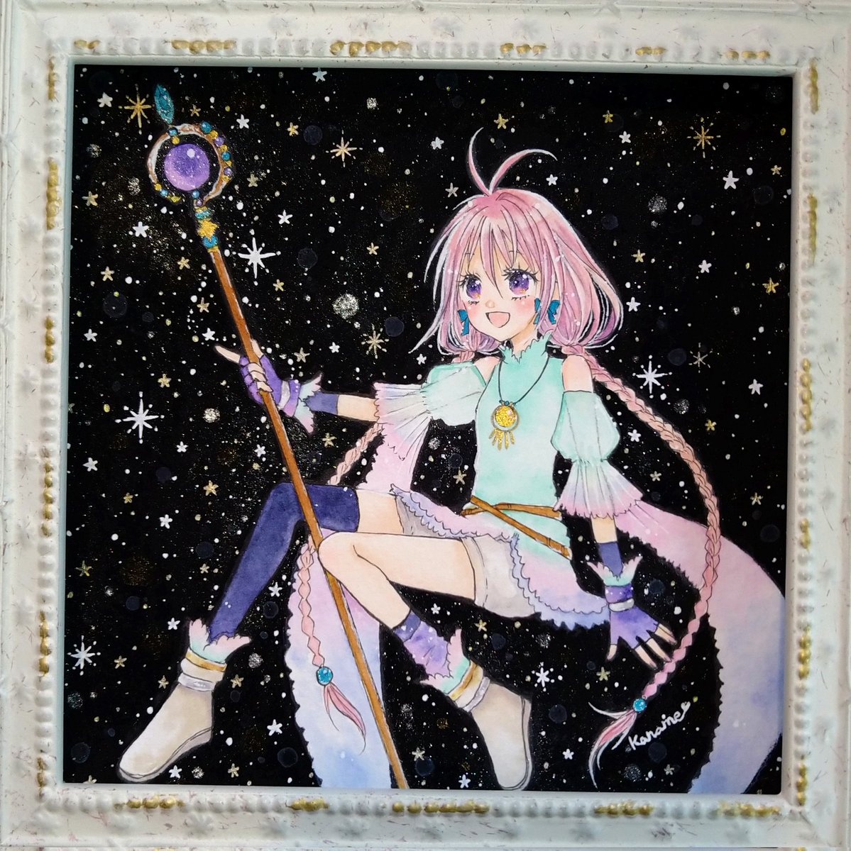 ビー玉と空。2ndさんで開催中の #君のスパークルサイン に送り出した額装作品とドローイング。 創作キャラのシエライユという14歳の魔法使いの少女です。 身につけている装飾品が魔力を高める鉱石って自分設定があるので、今回のテーマに合わせて描きました。 お気に入りの子です😊 twitter.com/i/web/status/1…