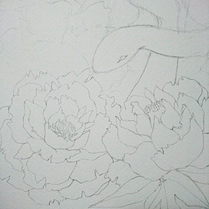 0 6 学生の時、日本画と友禅を勉強していたので、牡丹は本物見なくても描けるように(笑) まだ下描き。 早く色塗りたい〜✨ #イラスト好きな人と繋がりたい #イラスト #アナログ絵 #水彩画 20/07/11 22:01