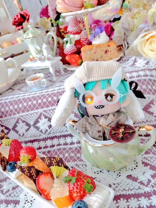 今日は紅音と、そうだ!家でヌン茶しよう😄😄♬*゚と準備してたくさん可愛い📷️が撮れました💕💕💕突如準備したけどテーマ🍓×ピンクでとっても可愛く設置出来ました!!自画自賛👏✨もぉ~うちの子カメラ目線上手なんよ😭💕可愛い~~ → #twstぬい撮り部