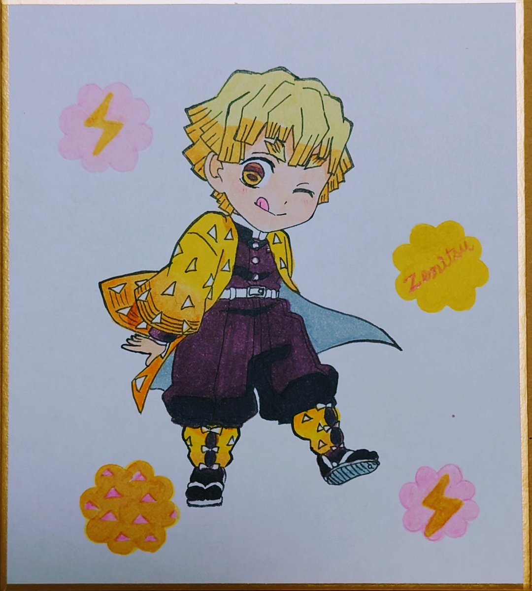 みるきーぜんいつ色塗りました😄💕💕 色紙には初めて描いたのだけどやっぱり滲みやすい🥲線画で手も変に〜ミニキャラって難しい〜😭💦 #鬼滅の刃 #鬼滅の刃イラスト #模写 #我妻善逸 #アナログイラスト #鬼滅の刃絵描きさんと繋がりたい #鬼滅の刃好きさんと繋がりたい