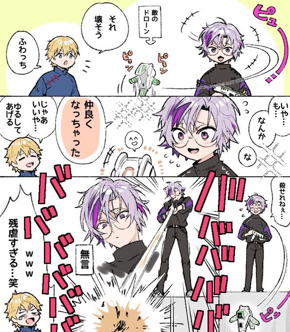 エビオ「ふわっちドローン壊そう!」 ふわっち「でも仲良くなっちゃったから…ころせねぇ………バババババババババババ!!!!!!!」 #絵スコート #絵クス絵画 #AQFWIN