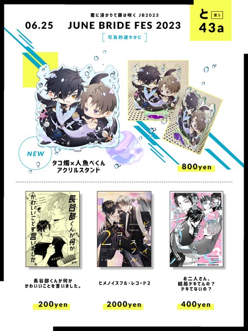 お品書き上げました! 新作はタコ燭×人魚べくんアクスタです🐙🧜♂️ 当日はよろしくお願いします~!💛💜 蜜藤JB2023/おしながき #pixiv pixiv.net/artworks/10924…