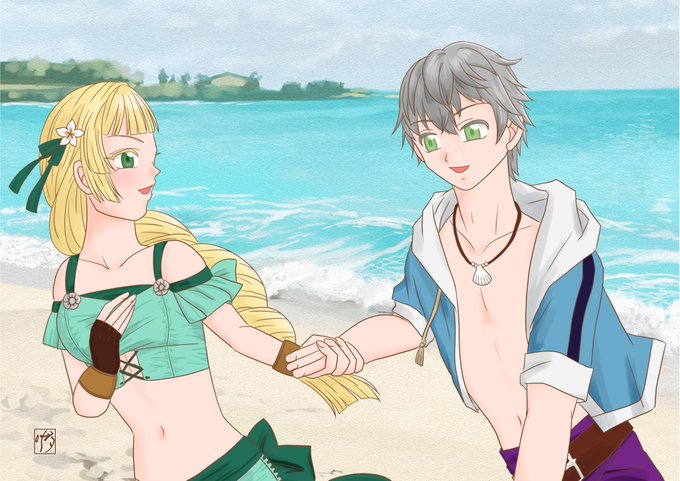 5 14 水着アシュインらくがき。 アクセの交換こ。 イングリットにアッシュの貝のネックレスをさせたかった 21/06/23 20:07