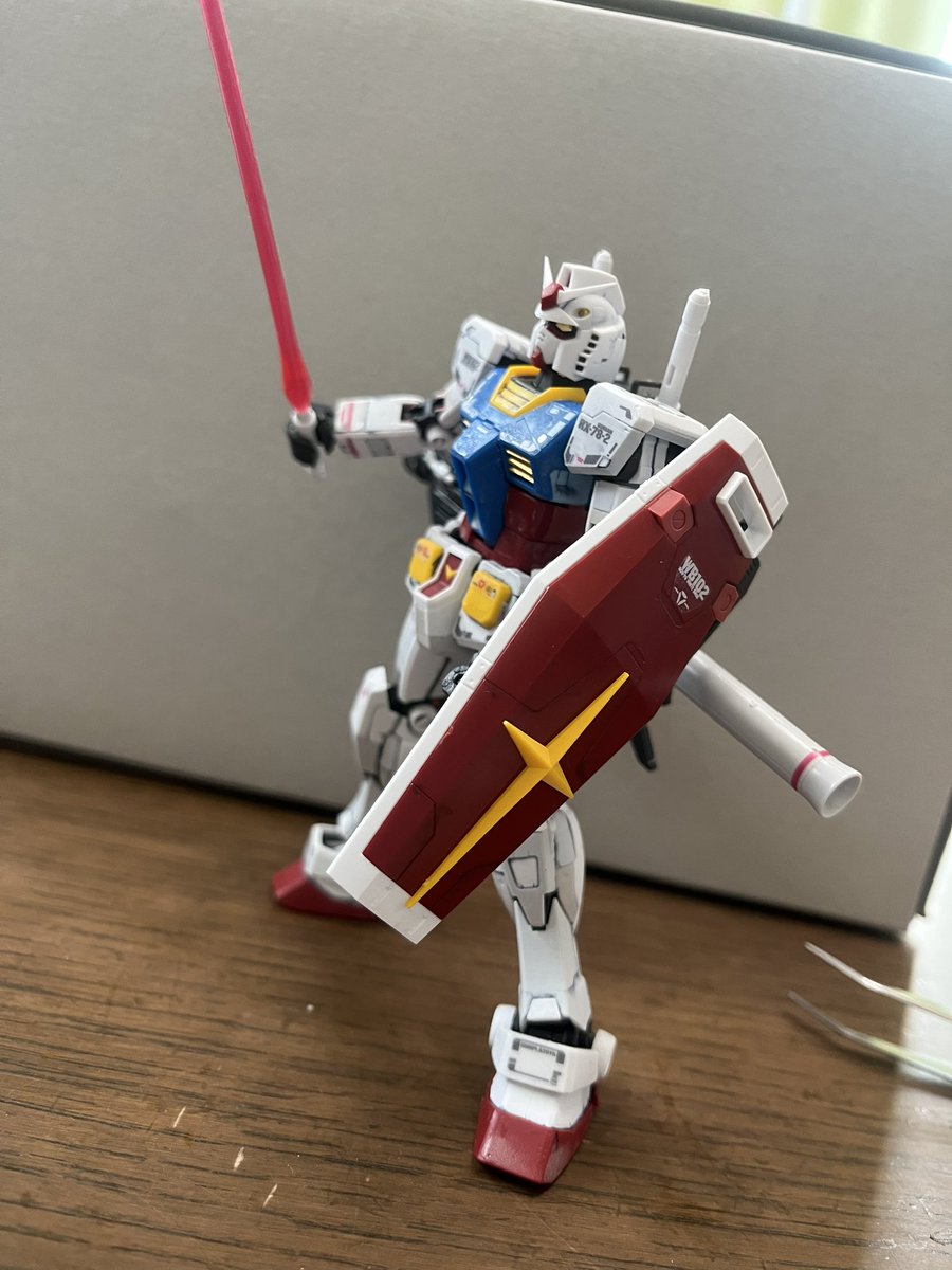 先週作ったRGのガンダムをトップコートのつや消しスプレーを噴いてステッカー貼って見ました めっちゃカッコ良くなりました。 #ガンプラ #ガンプラの画像貼るとRTされると聞いて #ガンダム #初めてトップコートやってみた