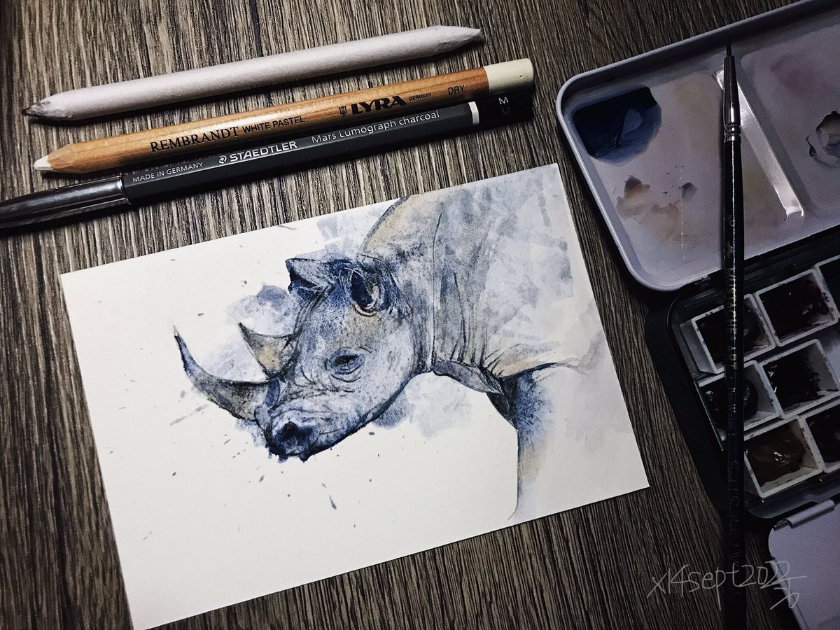 クロサイ Diceros bicornis - アルデバラン水彩紙、透明水彩、木炭鉛筆、ホワイトパステル ゾウ🐘とかサイ🦏とか、鎧のような皮膚で覆われた大きくて強い動物への憧れは幼い頃からずっとずっと。 力こそパワー。 #watercolor #illustration