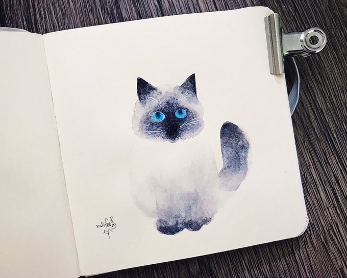 Pointed ・ 墨、透明水彩 ・ 私の心の中にはシャムミックスの猫が住んでいるので(初めて飼った猫)、猫(概念)を描こうとするとどうしてもこの柄の猫になってしまう。シールポイントカラー。 #watercolor #illustration