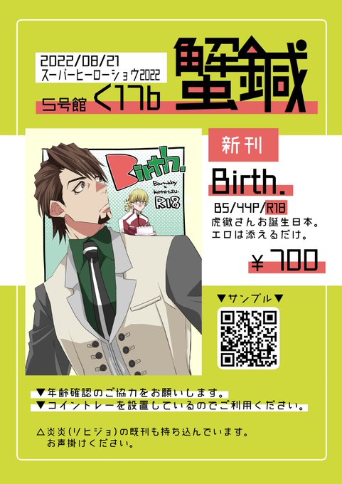 2022/08/21:5号館く17b[蟹鍼] 兎虎!2枚目は当日ポスターです。 🔥🔥リヒジョの既刊も持ち込みますが、机上に置くと何サークルか分からなくなっちゃうのでご入用の方はお声かけください。 支部:pixiv.net/artworks/10059… 新刊サンプル:pixiv.net/artworks/10056…