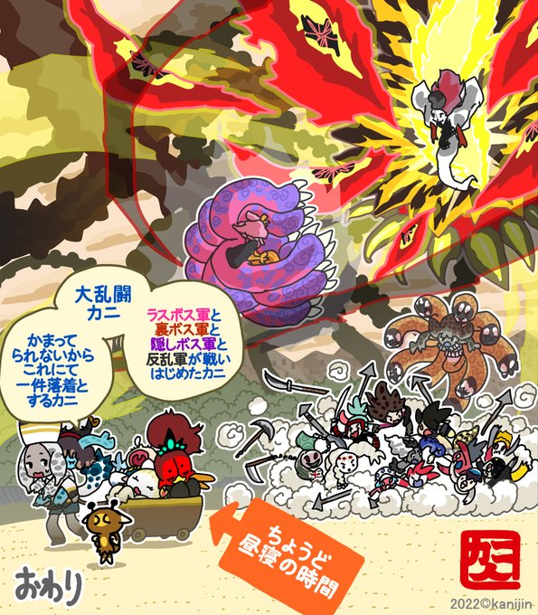 24 40 途中経過2.5 トップの変動はないけど4〜5位辺りがデッドヒートカニ。序盤トップ争いしてたヤマカガシマムシ親子が6〜7位に転落してるカニ。まったく先読めないカニね。人類は滅亡する。 23/01/14 08:12