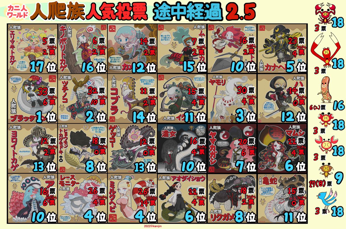 途中経過2.5 トップの変動はないけど4〜5位辺りがデッドヒートカニ。序盤トップ争いしてたヤマカガシマムシ親子が6〜7位に転落してるカニ。まったく先読めないカニね。人類は滅亡する。