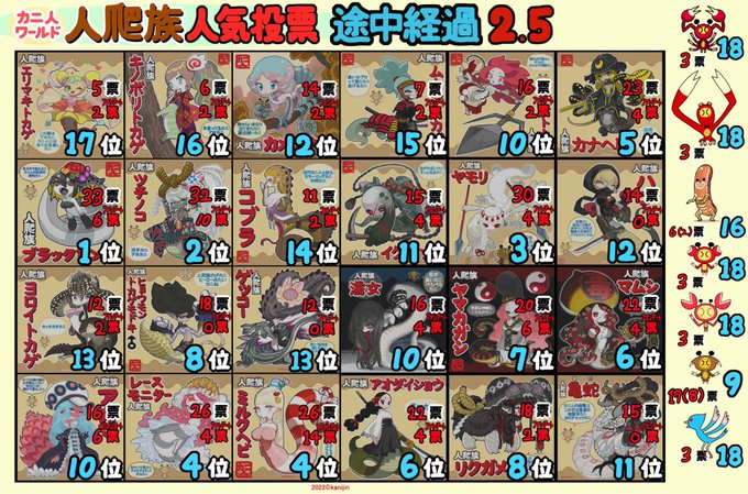 【人爬族人気投票}途中経過カニ。 まさかのブラックマンバちゃんトップカニ。まったくのノーマークだったから意外すぎるカニ。そしてなぜか5位にカニ人がいるカニ。またカニ人とニンゲンとの禁断のキッズが生まれてしまうカニ。更に立場悪くなるしそれだけは避けないとならないカニ。人類は滅亡する。