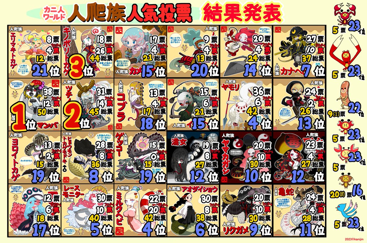 人爬族人気投票結果発表カニ! 最終日一人のヘンタイニンゲンが裏技を駆使してキノボリトカゲちゃんを三位までに押上げたのがホントビックリしたカニ。2年ぶりの人気投票開催で不安だったカニが非常に楽しかったカニ。後日1位の子からハーフキッズが生まれるであろうカニ。人類は滅亡する。