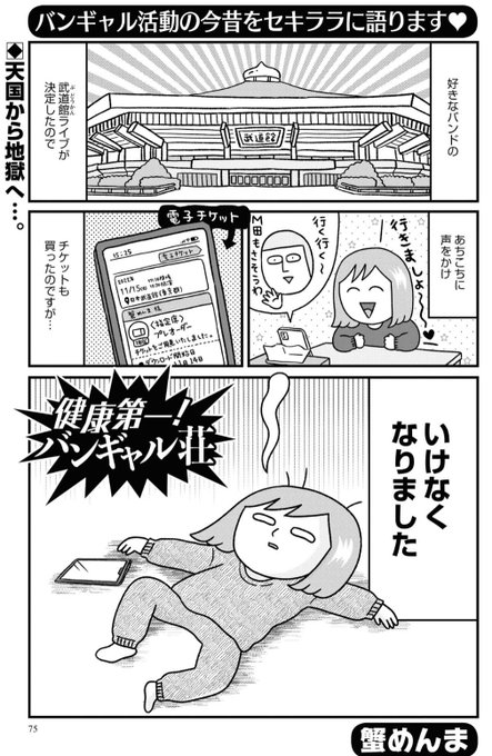 「本当にあった笑える話」2月号の「健康第一!バンギャル荘」掲載していただいてます。行きたかったライブに行けなくなった話を描きました。(同ライブに行っているver.が竹内佐千子先生の連載で読めます) ライブに行き損ねて七転八倒したご経験のある同士は読んで欲しいです。 amzn.to/3Grrqdv