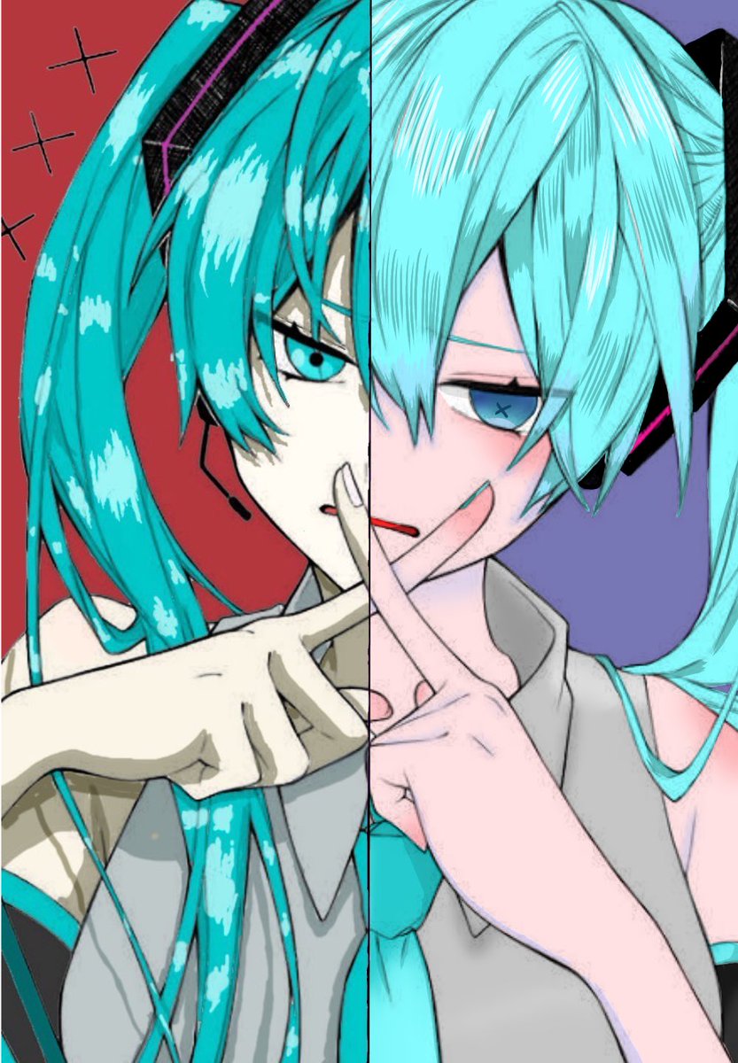 フリー線画を使わせていただきました。 兄と私で色を塗ってみました! 左が兄 右が私です。 一回やってみたかったから、できて良かった( ^ω^ ) 服の色がほとんど一緒!奇跡 #初音ミク #イラスト