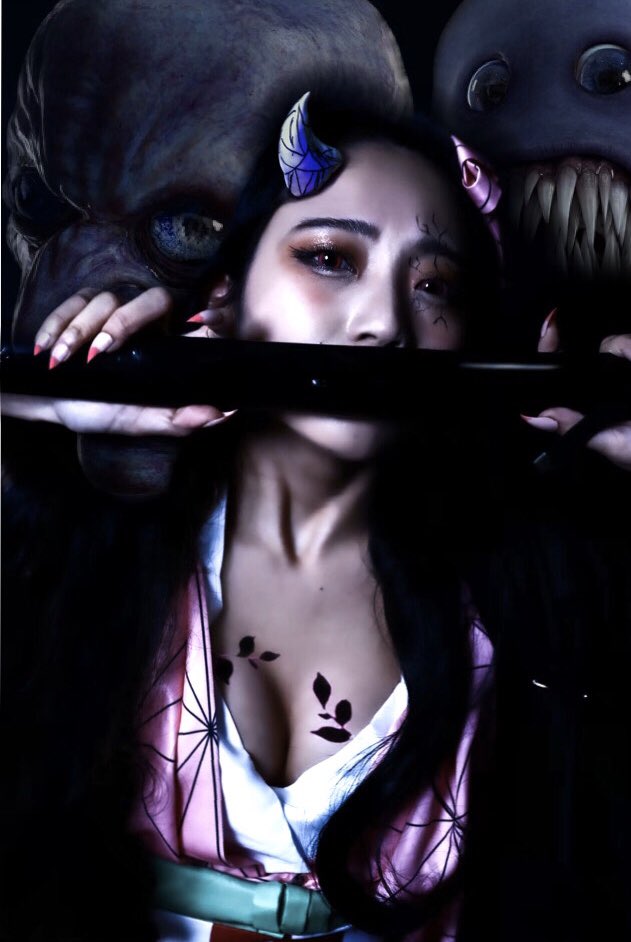 1 19 背景画像合成です。 仮面女子 月野もあさんの鬼滅の刃コスプレ画像を青鬼と合成してみました。実写版としていけますね。🤗 #鬼滅の刃 #コスプレ 20/02/13 18:04