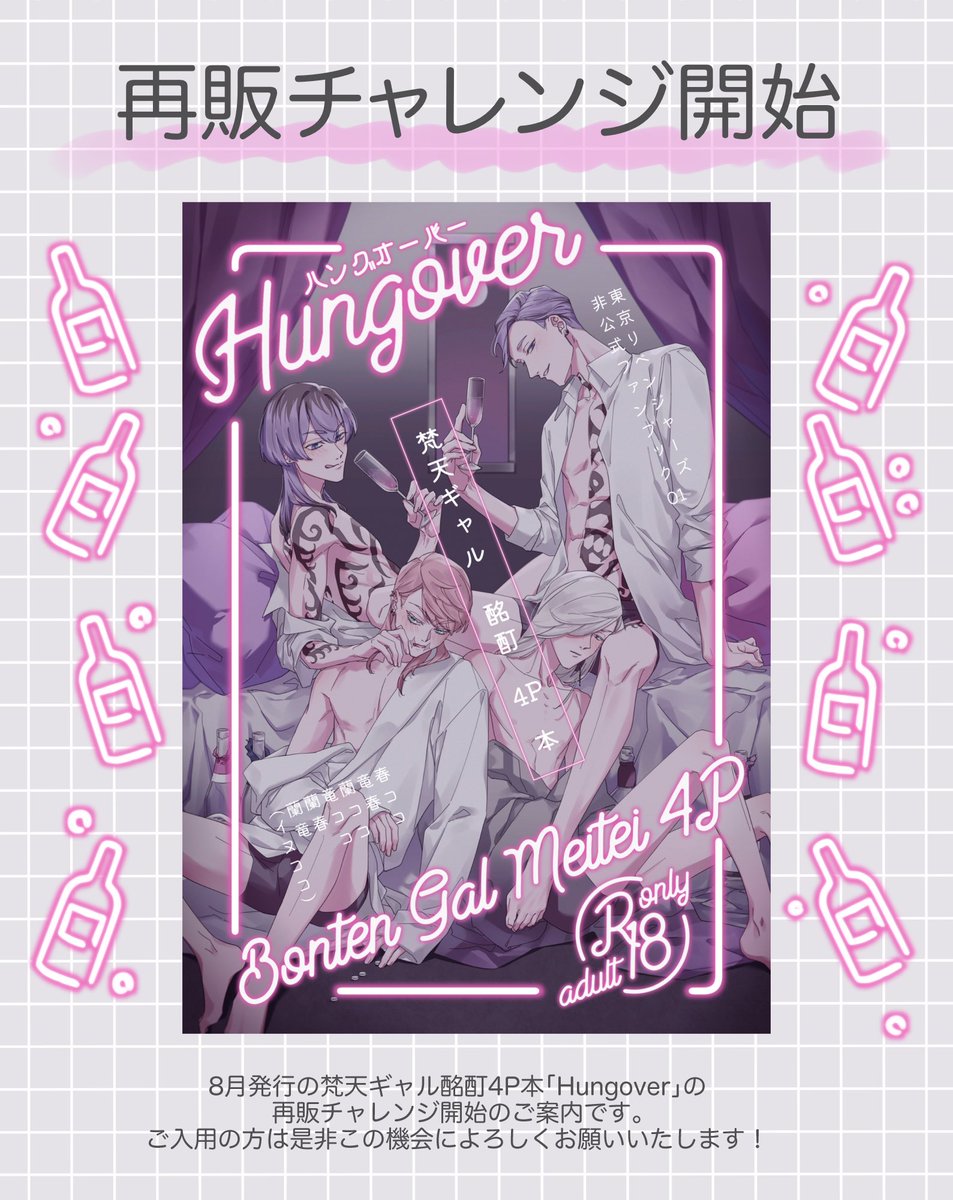 8月のイベントで発行した梵天ギャル酩酊4P本「Hungover」の再販チャレンジが開始しました! ec.toranoana.jp/joshi_r/ec/ite… 通販ページの「予約する」を押すと再販チャレンジに参加したことになります (詳しくは通販ページの「再販予約とは?」のページをご参照ください) 12月のイベント合わせでの再販です→