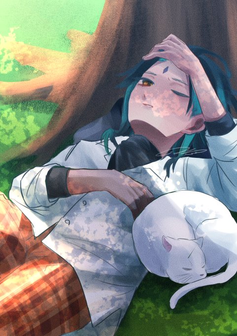8 36 #原神 #原神イラスト ※学パロ 中庭でよく見かける魈くんは今日も猫と昼寝してるみたい 23/05/24 20:10