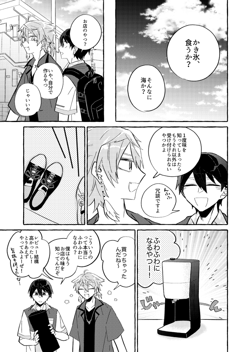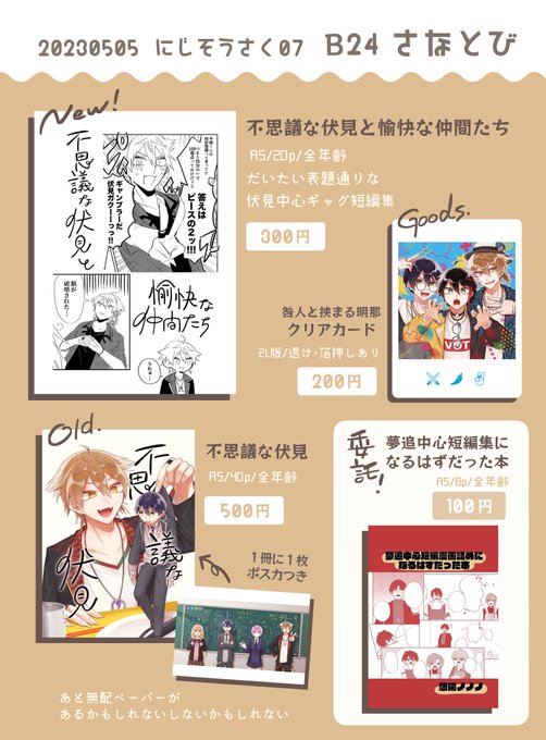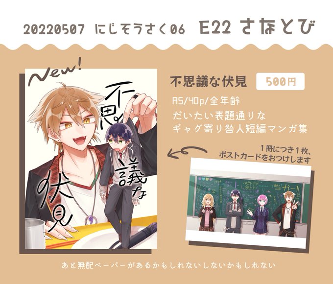 #にじそうさく06 (2/2) てことで新刊サンプルです!! 咎人短編集でます!だします!!! 前回無配かき氷話+描き下ろし3本の表題通りな感じになります🦊⚔ 長めのサンプル+詳しくはこちら⏬ pixiv.net/artworks/98074… 本文40p/A5/全年齢/500円 【E22 さなとび】にて!よろしくおねがいします!!