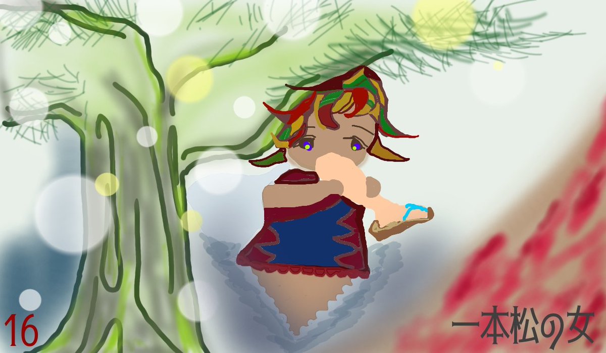 一本足の姿をして松の木の近くに立っていて、人を招き寄せて片足を食いちぎるよ。(ここに描きました絵はあくまでも御本を読んでググりもせずにわたしの勝手な想像だけで描いたものですので叱らないでください)お草履を落とさないでお行儀の良い感じにしました。 #日本怪異妖怪事典_関東