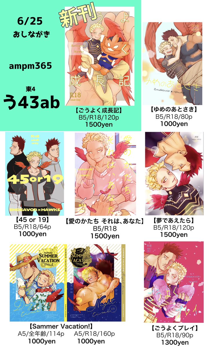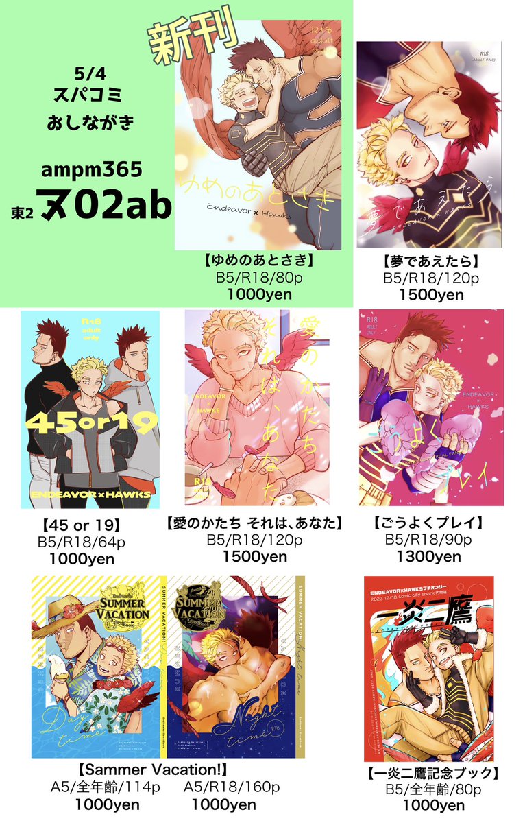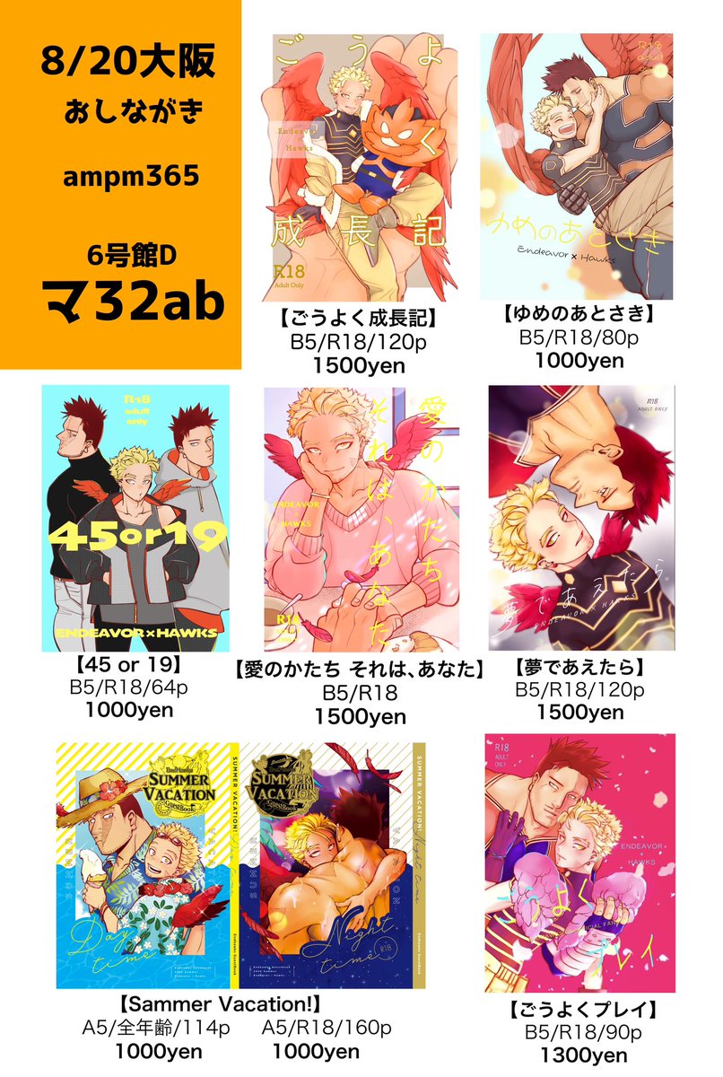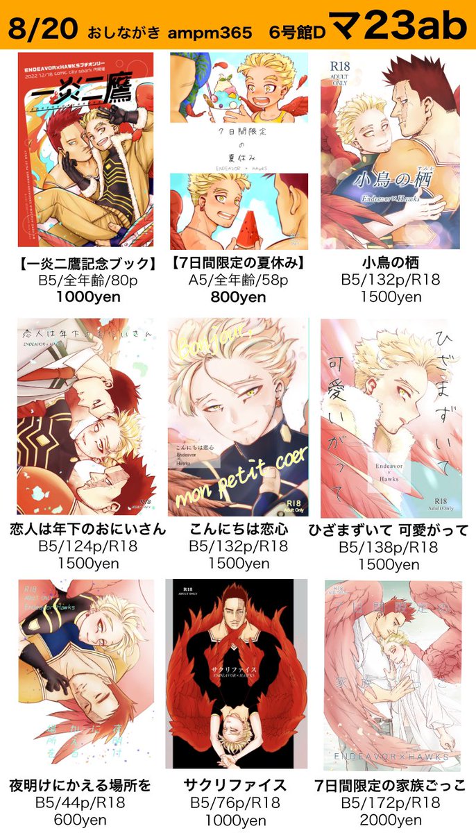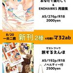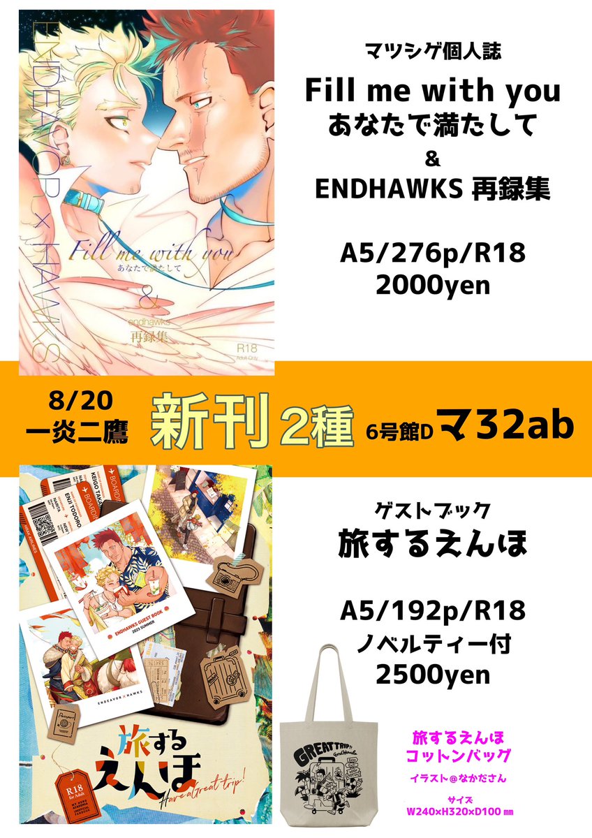 8/20インテ【一炎二鷹】おしながき 新刊は個人誌【Fill me with you】とゲストブック【旅するえんほ】の2種類です✈️ 既刊もいろいろ持ち込みます! 個人誌サンプル↓ pixiv.net/artworks/11033… ゲスト本サンプル↓ pixiv.net/artworks/11055…