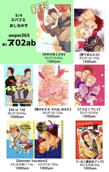 【5/4炎ホの本お品書き】 相変わらずデザインもくそもない一覧表ですんません😹ぜひ遊びに来てね✨ワイワイ ★当日は梅松さん@2d_ume の既刊をご本人ごと委託してます! 🪶新刊【ゆめのあとさき】第1話→ pixiv.net/artworks/10732… 🐯書店→ ec.toranoana.jp/joshi_r/ec/app…