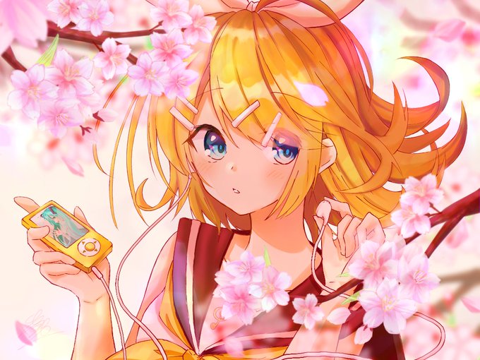 桜とリンちゃん描きました…‼︎🌸💛 #鏡音リン