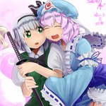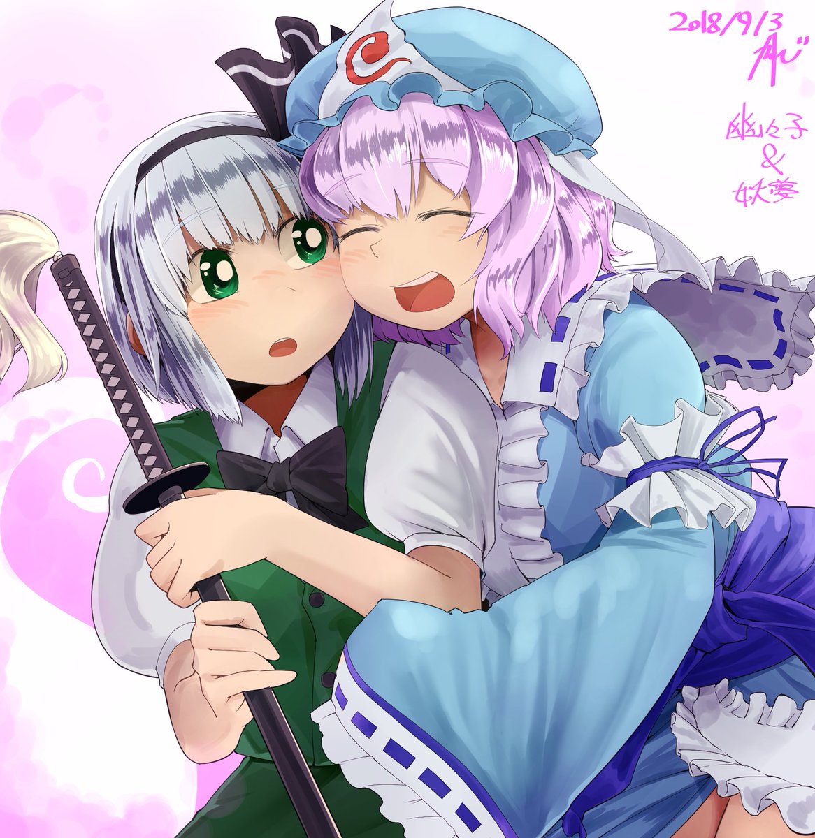 43 93 幽々子と妖夢です。抱きつかせたり抱きかかえさせるの好きだな。お納めくださ~~い。 18/09/03 23:32