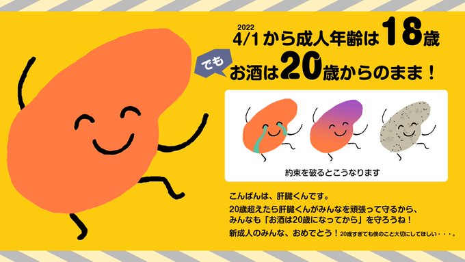 5017 6041 肝臓くんです。 明日、2022年4月1日から日本は民法改正で成人年齢が引き下げられるけど、お酒の解禁年齢は変わらないよ。 自分の体を大切に。肝臓くんと約束🍺 未成年も大人も、みんなそれぞれの肝臓くんと仲良くしてね!新成人のみんなおめでとう🎊 #肝臓くん #拡散希望 22/03/31 18:30
