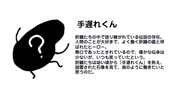 肝臓界に語り継がれる伝説の存在「手遅れくん」を紹介するよ。肝臓くんの目標なんだ!