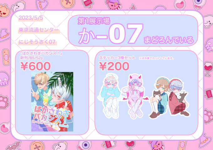 0 2 #にじそうさく07 お品書きと当日のポスター(A3)になります!新刊以外にステッカーを販売します あと記載してないのですが無配は出せたら出します 23/05/04 22:29