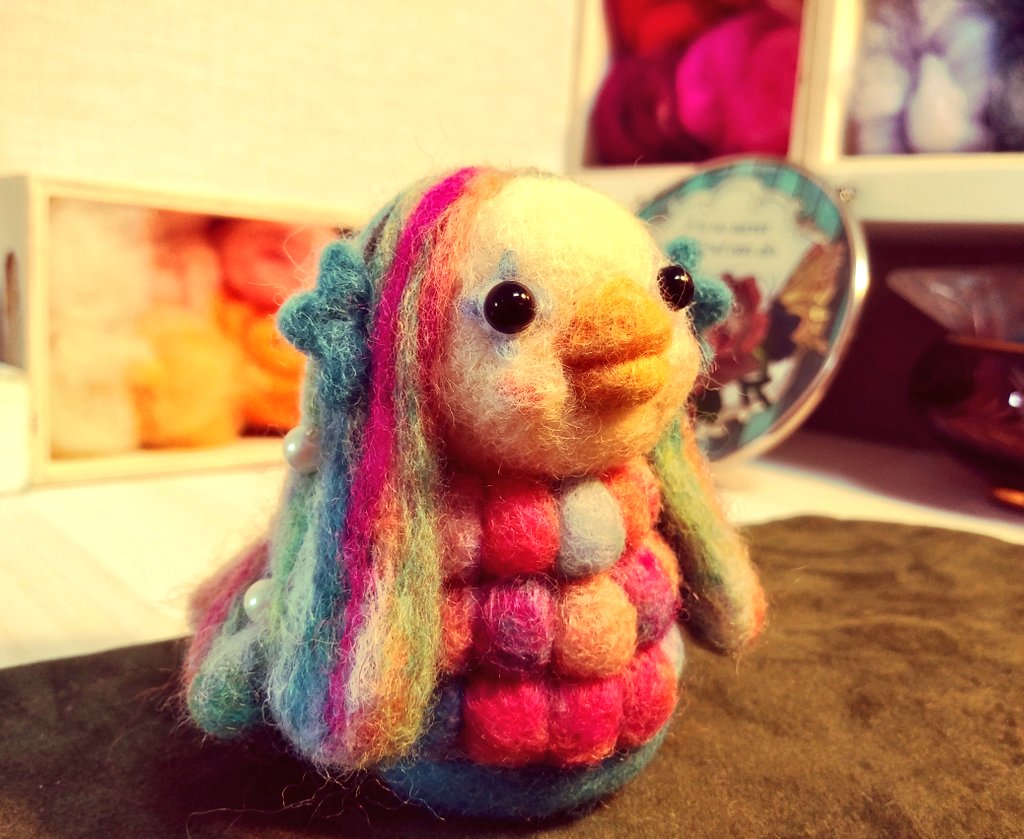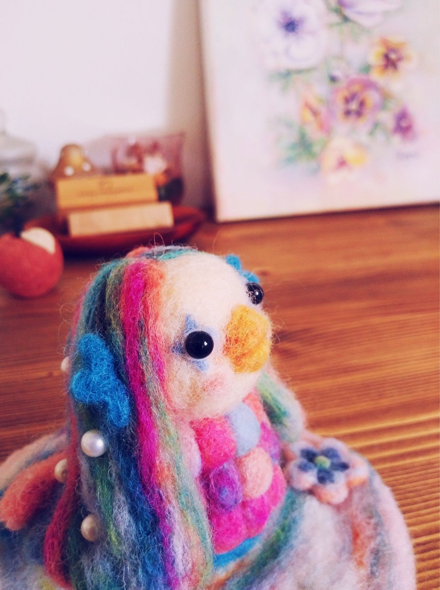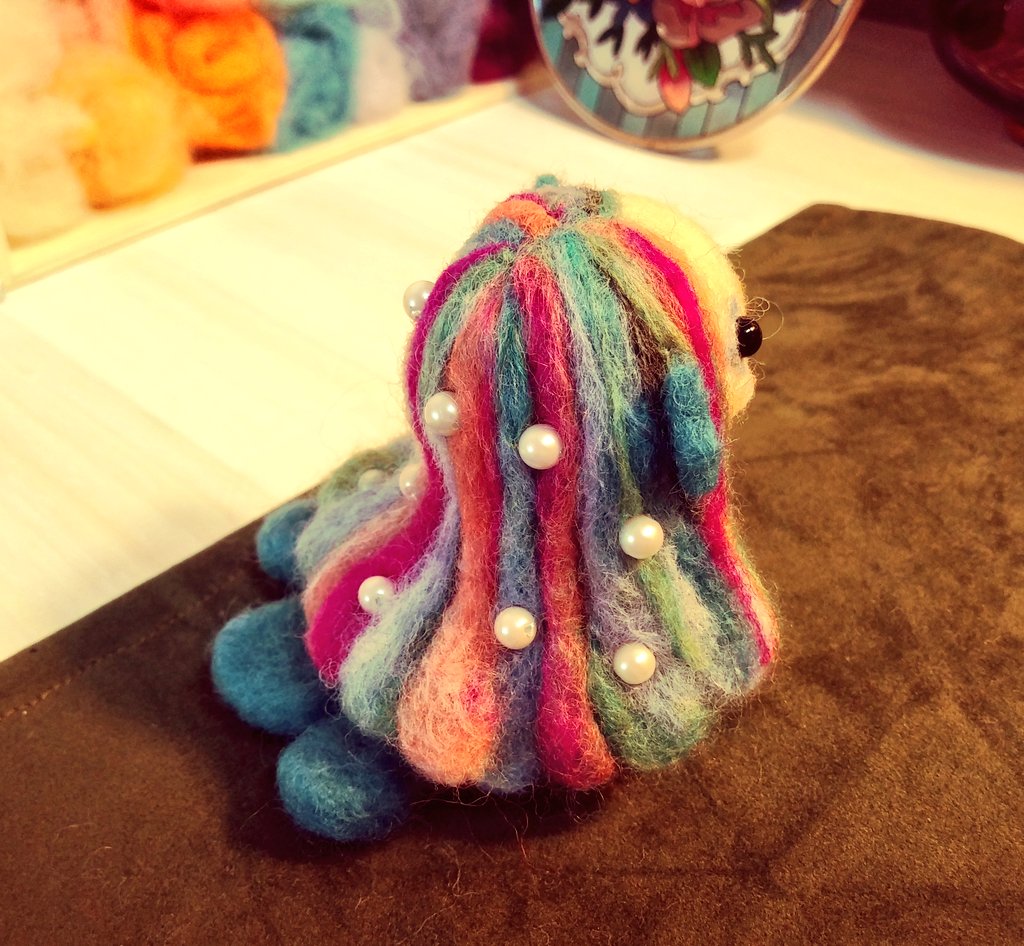 完成。 カラフルなドレッドヘアにパールをあしらいました♪ #羊毛フェルト #アマビエ様