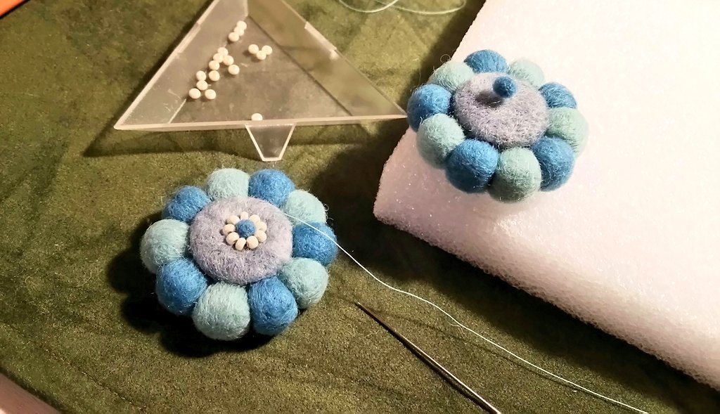 金曜日の納品目指して制作中。一つ一つビーズを縫い止める。細かいけれど好きな作業。色の組み合わせを考えるとワクワクする。 #羊毛フェルト #ビーズ