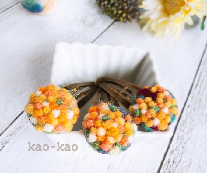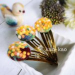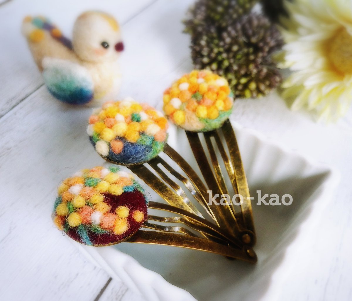 0 4 ミモザのヘアピンできました✨個人的には紫色のがお気に入り😊 #羊毛フェルト #委託販売 22/03/27 13:37
